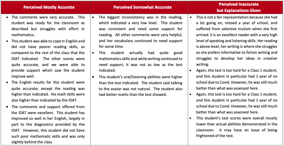 Of the inaccuracies described, there was only one comment which indicated a student who tested higher than abilities, and other comments indicating discrepancies showed that the IDAT indicated lower abilities than ascertained by teachers. In the case of the student with lower abilities than the test, it was indicated that this student took the test twice, which is not advised by IDAT.